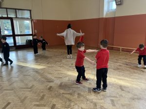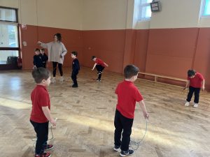 This week in P.E. we worked on our jumping skills and tried some skipping. We also had some fun with the colourful parachute!